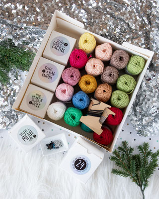• Häkelanleitung als PDF • Bastelmaterial für 4 Advent-Kästchen • Digitale Schnitzeljagd mit witzigen Rätseln • Bonusanleitung zum 24. Dezember |