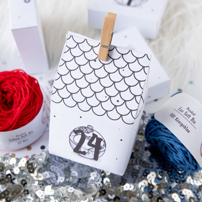 • Häkelanleitung als PDF • Bastelmaterial für 4 Advent-Kästchen • Digitale Schnitzeljagd mit witzigen Rätseln • Bonusanleitung zum 24. Dezember |